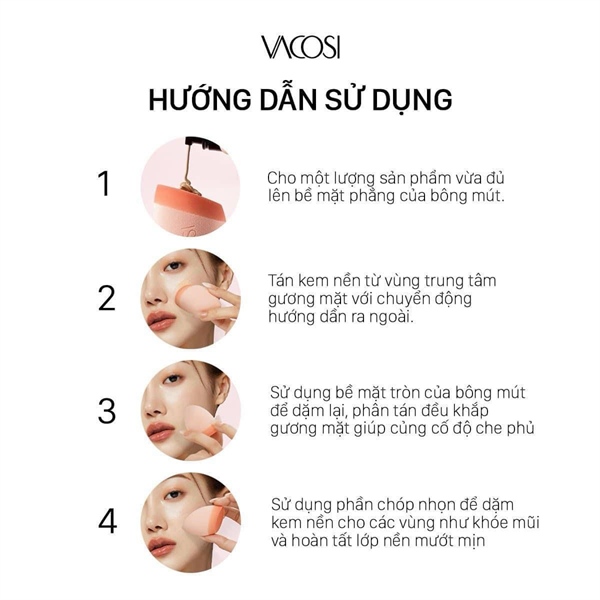 BÔNG MÚT TRANG ĐIỂM VACOSI THẾ HỆ MỚI Kết hợp độc đáo trên 2 nền chất liệu Hydrophilic & Vegan Silicone (Bông mút phủ Silicone). Công nghệ X2 BOUNCY kết cấu đàn hồi mềm mại để lớp nền căng mướt. Thiết kế đầu nhọn dàn trải kem nền len lỏi đến những góc cạnh trên khuôn mặt. Chất liệu Hydrophilic giúp bông “ngậm” định lượng nước và điều chỉnh theo ý đồ của người dùng: lớp nền căng mướt, lớp nền che phủ, cố định nền… Lớp phủ VEGAN Silicone màng chắn siêu êm trên mặt phẳng, không thấm ngược giúp điều tiết lượng kem vừa đủ để tiết kiệm kem nền. Mang đến hiệu ứng nền HD, thao tác dặm nhẹ nhàng êm mềm tạo liên kết chặt chẽ giữa các layer cho lớp nền mỏng nhẹ