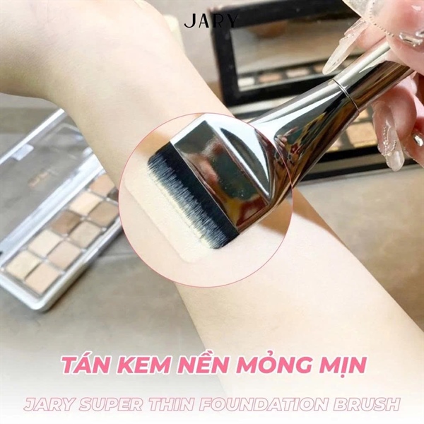 Cọ tán kem nền dạng lông đầu dẹt Jary Super Thin Foundation Brush với thiết kế ánh bạc chắc chắn cùng shape cọ dẹp ngắn có độ bó chặt giúp lấy sản phẩm lên da nhiều và dễ dàng hơn. Ngoài chức năng dàn đều nền trên da, cọ còn có thể dùng cho các sản phẩm dạng lỏng khác như kem chống nắng, kem lót... Chất lông tổng hợp hiện đang là xu thế hiện nay, bởi độ an toàn và thân thiện với môi trường, thêm vào đó là phù hợp với mọi loại da. Là sự kết hợp hoàn hảo giữa que tán kem nền và cọ trang điểm được ưa chuộng với thiết kế mỏng, dẹt giúp lớp nền khi tán ra được đều, mướt và tệp lì tự nhiên trên da.