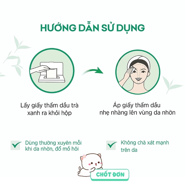 Áp giấy thấm dầu nhẹ nhàng lên vùng da nhờn. Chú ý không chà xát mạnh. Dùng thường xuyên mỗi khi da nhờn, đổ mồ hôi.
