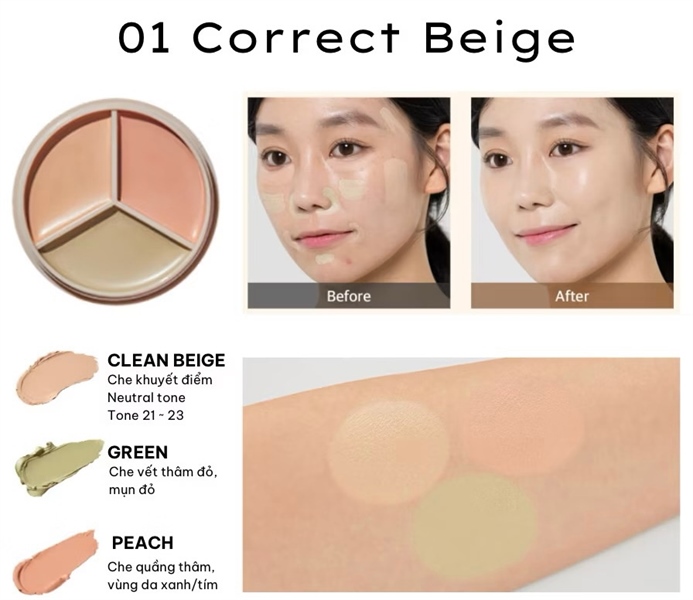 -Ba màu, được chia nhỏ theo các khuyết điểm da khác nhau, không chỉ che khuyết điểm mà còn tạo hiệu ứng tạo đường viền.