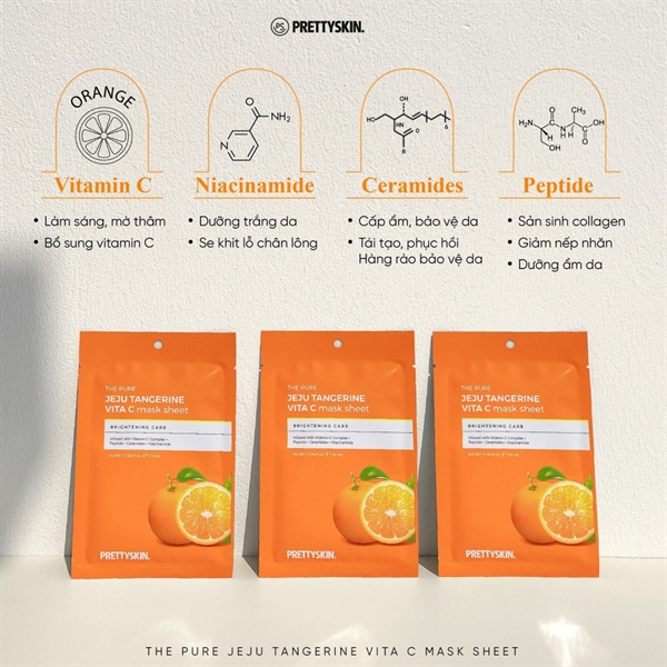 Công dụng Mặt nạ Vitamin C Pretty Skin The Pure Jeju Tangerine Vita C Mask SheetLàm sáng da: Vitamin C giúp ức chế sự hình thành hắc sắc tố, từ đó giúp làm sáng da và giảm thiểu các vết thâm nám.