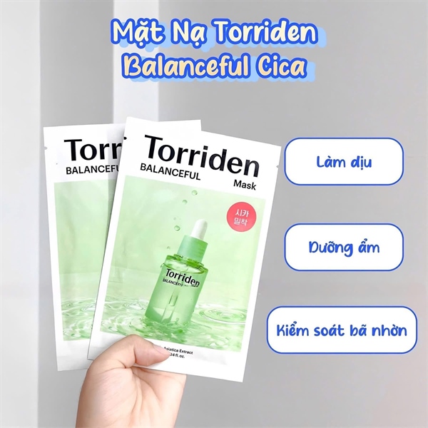 - Torriden Balanceful Cica Mask 25ml là dòng mặt nạ thuộc bộ dưỡng da Balanceful Cica của Torriden có khả năng làm dịu da chuyên sâu, đồng thời củng cố hàng rào bảo vệ cho nhạy cảm nhờ phức hợp Cica mang lại làn da khỏe mạnh.