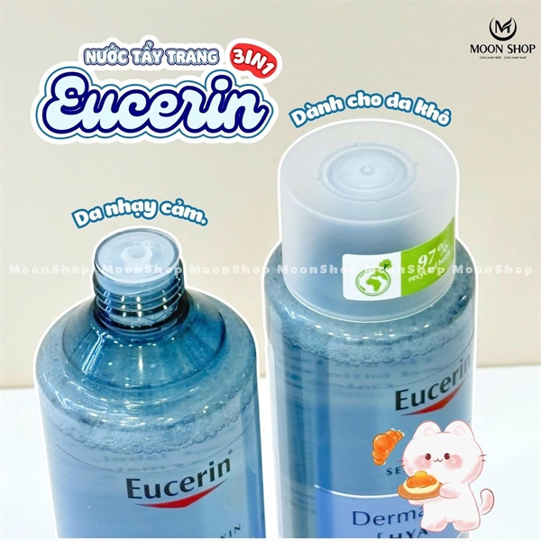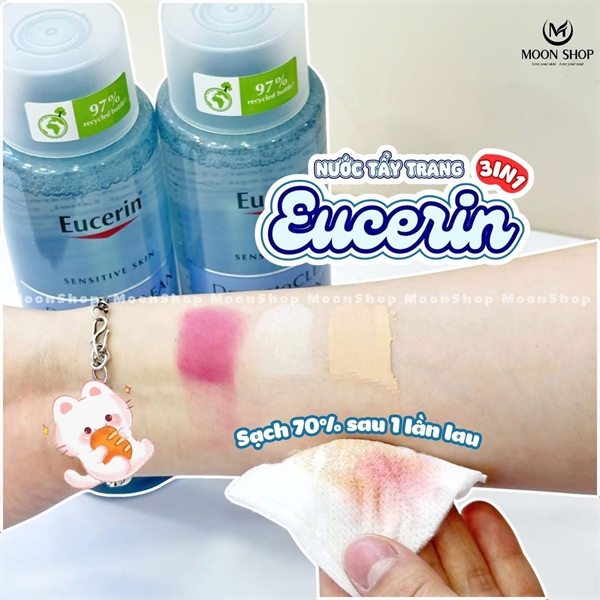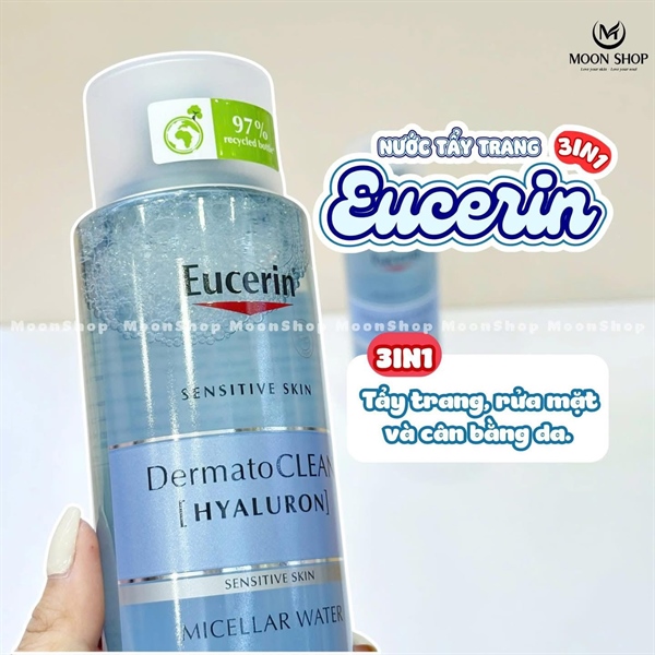 Nước Tẩy Trang Eucerin Dermatoclean 3in1 400ml là sản phẩm tẩy trang dạng nước dịu nhẹ, có công dụng làm sạch sâu lớp trang điểm, bụi bẩn và bã nhờn, đồng thời cấp ẩm cho da nhờ chứa Hyaluronic Acid và Gluco-glycerol, giúp da thông thoáng và mềm mịn, phù hợp cho mọi loại da, kể cả da nhạy cảm.