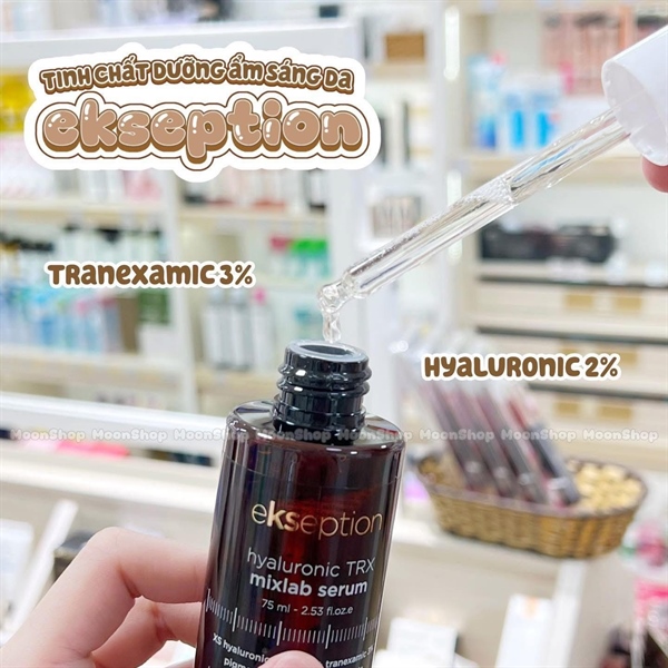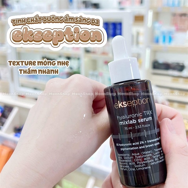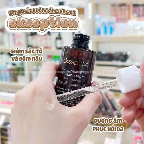 - Serum sáng da, mờ nám Ekseption Hyaluronic TRX với thành phần TX 3% và XS Hyaluronic Acid 2%. Công thức cho tác động kép giúp làm sáng nhờ vào việc ức chế tổng hợp tyrosinase ở tế bào hắc tố đến tế bào sừng ở thượng bì. Từ đó làm giảm độ nhạy cảm, phục hồi hàng rào bảo vệ da và cải thiện tình trạng sạm nám, da đều màu nhanh chóng. Và tăng cường giữ ẩm, làm mềm mịn và căng bóng mà không làm khô da như các sản phẩm điều trị sạm nám thông thường.