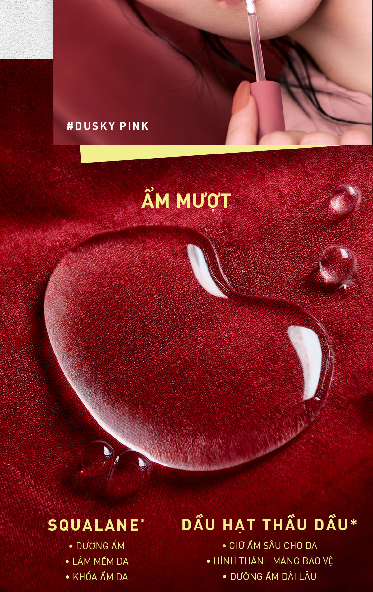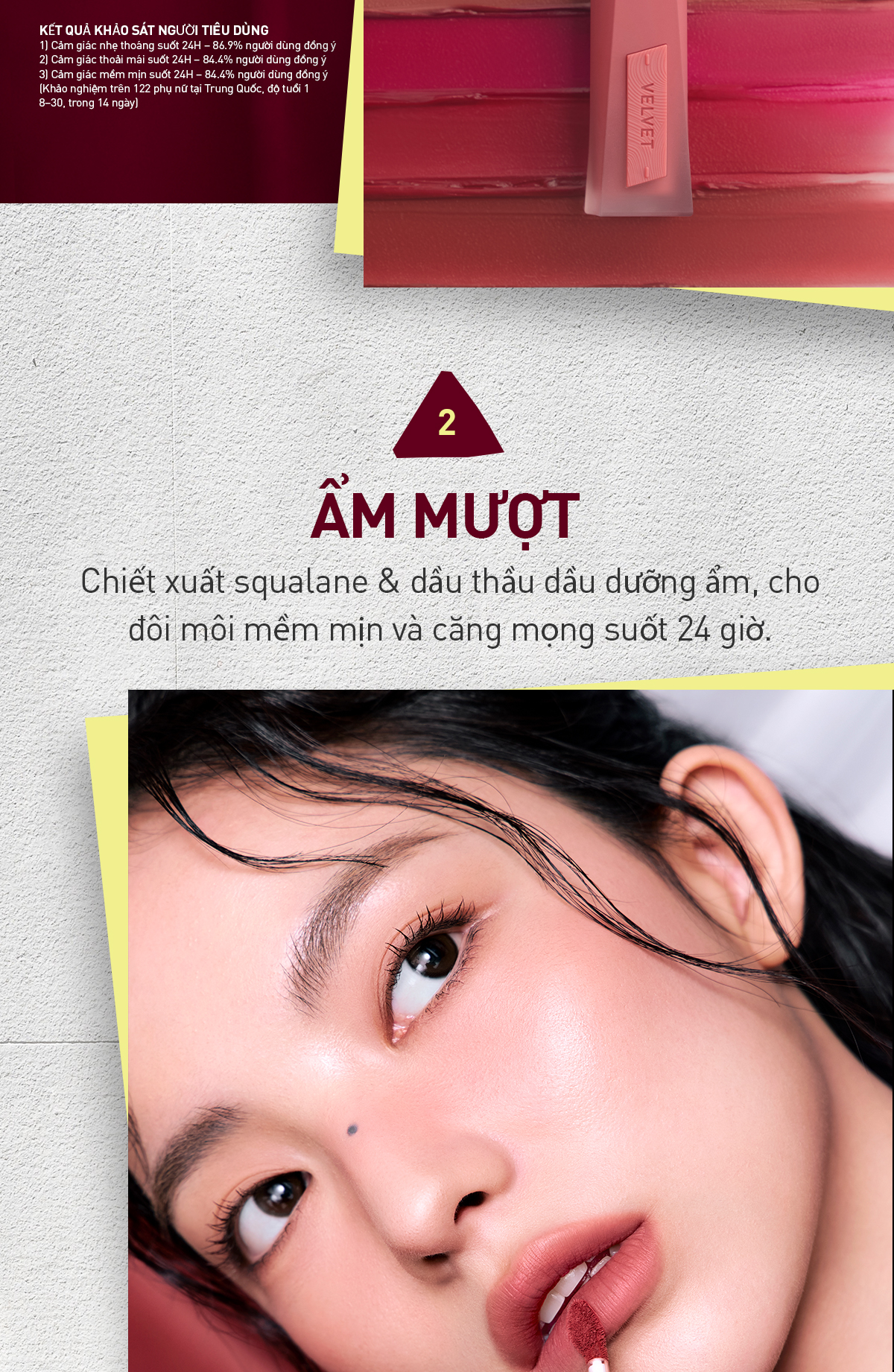• Công thức son mang lại cảm giác nhẹ tênh, không gây khô suốt 24 giờ