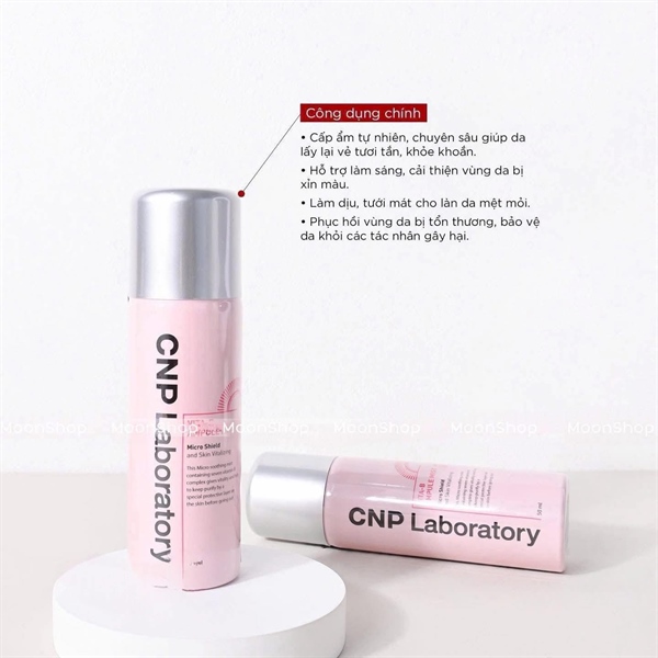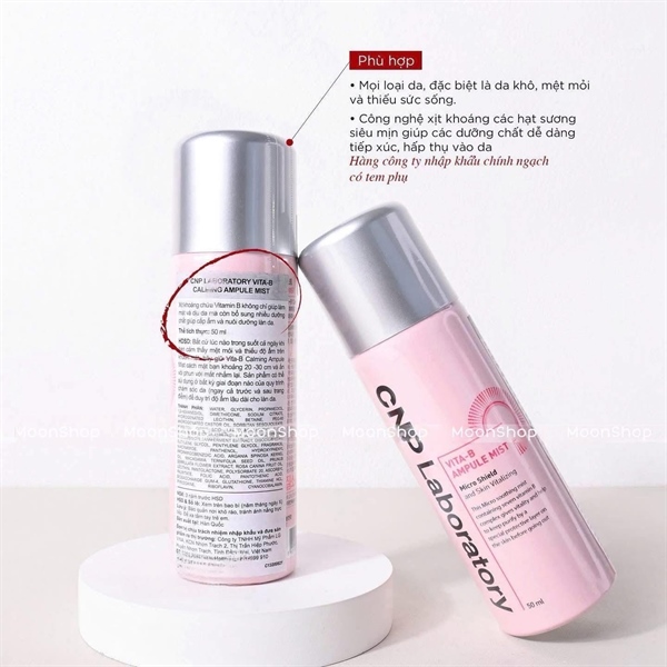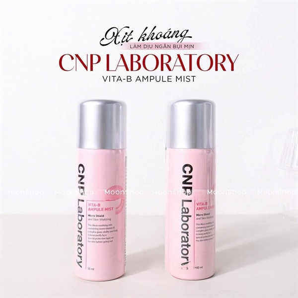 ̣ ́ Dung tích:50mlXuất xứ: Hàn Quốc Những giọt sương siêu nhỏ chứa phức hợp giúp giữ da sạch sẽ với một lớp bảo vệ đặc biệt từ:+ Phức hợp của 7 loại vitamin B mang lại năng lượng ẩm cho da gồm vitamin B1, B2, B3, B5, B6, B9, B12 cải thiện cho làn da xỉn màu.+ 3 loại dưỡng ẩm chăm sóc lớp màng ngoài bảo vệ da: Tầm Xuân, Argan và Macadamia- Thành phần chức năng làm trắng Niacinamide, Glutathione cũng được thêm vào cho hiệu quả làm sáng mỗi ngày. Xịt Khoáng Dưỡng Da CNP Laboratory Vita-B Ampule Mist ngăn chặn mụn trứng cá hoặc nhiễm trùng và cung cấp dinh dưỡng trong ngày cho da mạnh mẽ không khác gì huyết thanh. Ngay khi bạn xịt, các hạt tinh chất nhẹ và mịn như sương sẽ được phủ đều lên toàn bộ khuôn mặt. Lớp sương giúp phục hồi độ ẩm hồng hào cho da, phủ một lớp ẩm làm cho làn da trở nên trong suốt và sáng mịn, được nhiều ngôi sao Hàn Quốc sử dụng vì ngăn ngừa mụn trứng cá gây ra bởi việc trang điểm. Bổ sung khả năng chống viêm, thu nhỏ lỗ chân lông. Dành cho làn da bất cứ ai có làn da xỉn màu, nhiều nếp nhăn, khô tróc hay dễ kích ứng, thường xuyên trang điểm