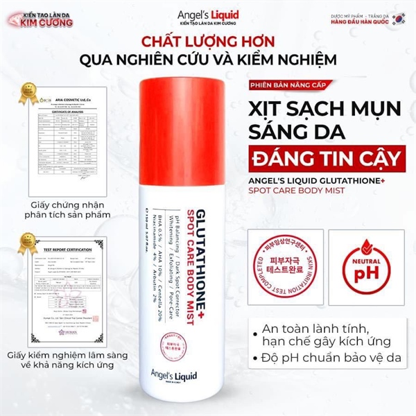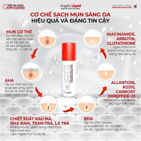 XỊT MỤN LƯNG GLUTATHIONE CENTELLA CALMING•Xuất xứ : Hàn Quốc Dung tích: 150mlXóa sạch thâm mụn: Sự kết hợp hoàn hảo từ Glutathione và Niacinamide loại bỏ tình trạng thâm sạm nhanh chóng, dưỡng trắng ưu việt, se khít lỗ chân lông, ngăn ngừa tình trạng mụn tái phátĐặc trị mụn lưng, mụn mông, mụn ngực chỉ sau 7 ngàyTrị thâm sau mụn, dưỡng da căng mịn, trắng hồng hiệu quả sau 7 ngàyHiệu quả được kiểm chứng lên đến 93% mụn trên lưng và ngực ( Do hiệp hội da liễu Hàn Quốc chứng nhận)Công nghệ Nano Glutatione kết hợp Centella giúp sản phẩm hiệu quả 3 trong 1: Trị mụn, trị thâm và dưỡng trắng Công Dụng : Điều trị mụn chuyên sâuXóa thâm mụn triệt đểSe khít lỗ chân lôngLàm dịu làn daNgăn ngừa mụn tái phátCách sử dụng :– Sử dụng 2 lần/ngày sáng và tối sau khi tắm.– Xịt sản phẩm lên vùng da mụn và thâm– Để khô tự nhiên khoảng 30 giây để sản phẩm dễ dàng thấm sâu vào lớp da bên trong hơn.