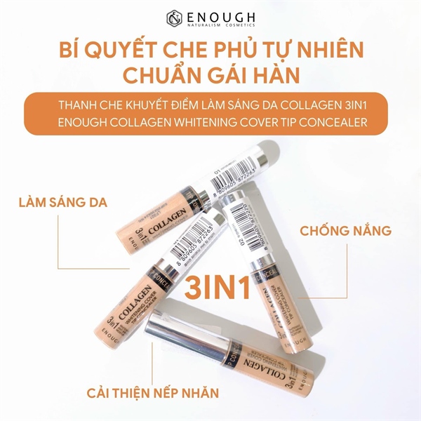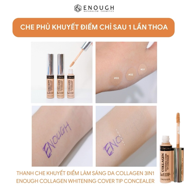 THANH CHE KHUYẾT ĐIỂM LÀM SÁNG DA COLLAGEN 3IN1 ENOUGH - BÍ QUYẾT CHE PHỦ TỰ NHIÊN CHUẨN GÁI HÀN Làn da trắng sáng và mịn màng chuẩn gái Hàn luôn là ao ước của nhiều cô gái. Tuy nhiên, không phải nàng nào cũng tìm được cho mình sản phẩm che phủ những khuyết điểm hiệu quả trên da. Vậy hãy để Enough gợi ý cho nàng món bảo bối luôn có mặt trong túi xách của mọi cô gái xứ Hàn - ̂́ đ̂̉ ̀ ́ . Điểm mạnh của em này chính là chiết xuất collagen thủy phân đóng vai trò dưỡng ẩm lâu dài cho làn da. Kết hợp cùng chất kem cực kỳ lỏng mịn nên nàng dễ dàng tán một cách dễ dàng mà không lộ vệt trắng kém tự nhiên. Hơn nữa, em này còn tích hợp khả năng chống nắng tối ưu với SPF 36/PA +++. Đây chính là trợ thủ đắc lực bảo vệ làn da trước tia tử ngoại đầy độc hại. Bên cạnh đó, độ che phủ cao sẽ giúp nàng che đi những khuyết điểm khiến nàng tự ti một cách tối ưu.