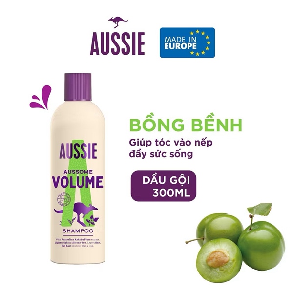 AUSSOME VOLUME giúp tăng độ phồng tự nhiên từ gốc nhờ chiết xuất quả mận Kakadu giàu vitamin C. Công thức còn kết hợp với trái cây thiên nhiên và các thành phần cấp ẩm giúp bảo vệ tóc