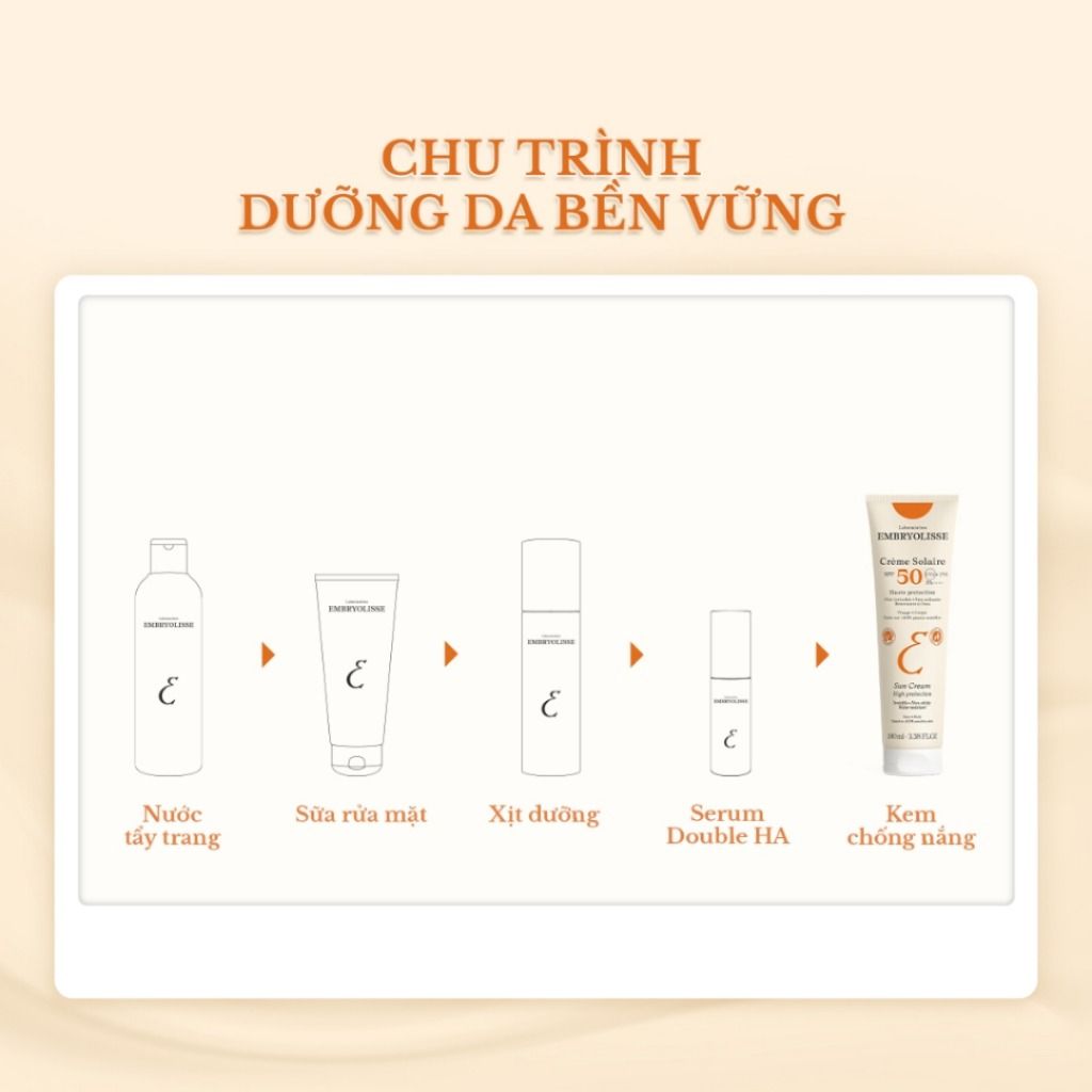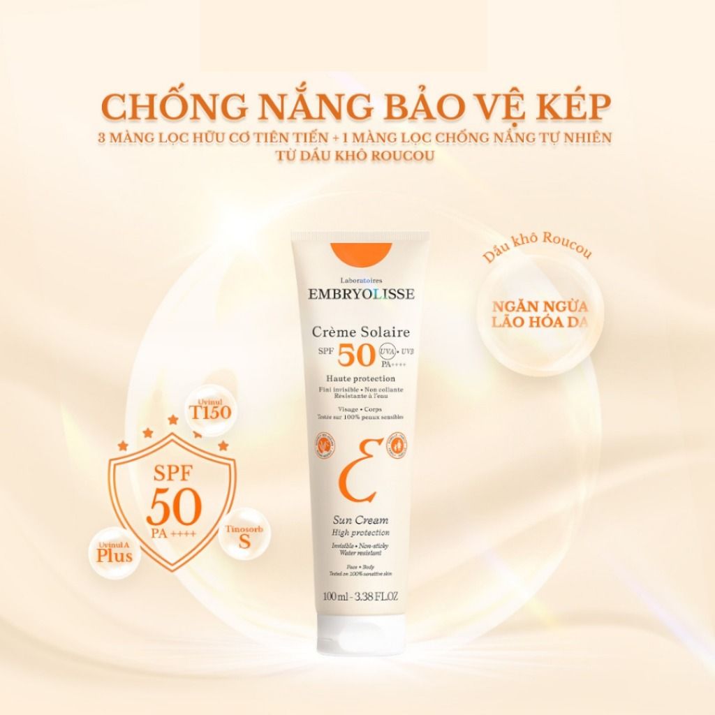 Embryolisse Kem chống nắng Crème Solaire SPF50 PA++++ 100ml với tiên phong trong xu hướng chống nắng mới khi kết hợp thành công giữa các màng lọc hữu cơ tiên tiến và axit béo thực vật từ dầu khô Roucou xuất hiện trong các bài báo khoa học thời gian gần đây – BẢO VỆ KÉP 2 tác động, chỉ số SPF 50 PA ++++ mang lại hiệu quả chống UV vượt trội (không chỉ với UVB mà còn ngăn UVA hiệu quả đến 96%, đặc biệt cả UVA1 với bước sóng 400nm)