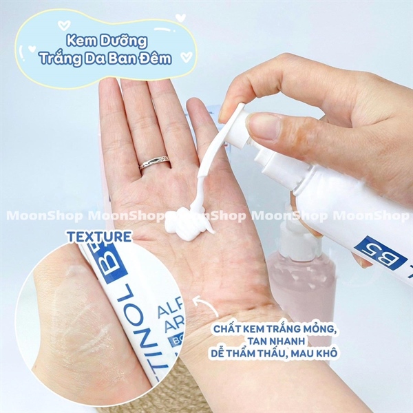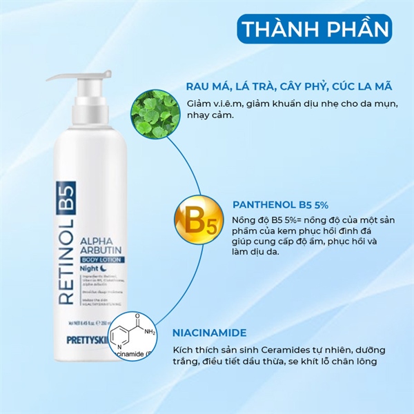 Pretty Skin Retionol B5 Alpha Arbutin Body Lotion – Ban đêmThành phần chính– Retinol: Giúp tái tạo làn da, kích thích sản sinh collagen và tăng cường tái sinh tế bào mới.