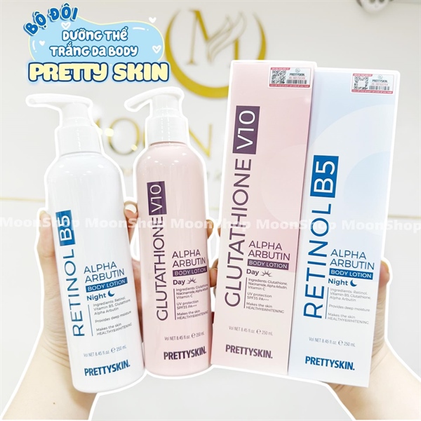 – Sử dụng bộ đôi Dưỡng thể Pretty Skin Alpha Arbutin Body Lotion hàng ngày, Glutathione V10 buổi sáng và Retionol B5 vào buổi tối trước khi đi ngủ để đạt được hiệu quả tốt nhất.