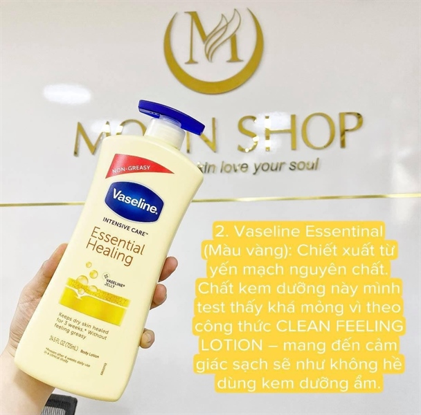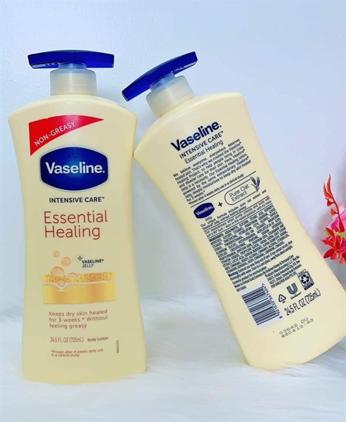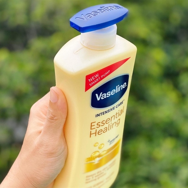 LOTION VASELINE 725ML Xuất xứ: Dubai• Lotion #Vaseline tổng hợp nhiều loại vitamin để bổ sung độ ẩm từ sâu bên trong tế bào. Ngoài ra, Vaseline bổ sung 100% chất dinh dưỡng cần thiết như Vitamin A, E, B .1. Vaseline Daily Brightening (màu hồng): Chứa những thành phần khoán chất là trắng sáng da toàn diện như huyết thanh chiết xuất từ Yaourt & Vitamin B3. Những dưỡng chất này cung cấp đủ độ ẩm cần thiết cho da sáng khỏe hơn. Và là một hàng rào bảo vệ giúp da chống lại ánh nắng mặt trời hiệu quả.2. Vaseline Essentinal (Màu vàng): Chiết xuất từ yến mạch nguyên chất. Chất kem dưỡng này mình test thấy khá mỏng vì theo công thức CLEAN FEELING LOTION – mang đến cảm giác sạch sẽ như không hề dùng kem dưỡng ẩm.3. Vaseline Cocoa Radiant (màu nâu) : kết hợp giữa tinh chất hạt Cacao và Vitamin E, giúp sữa thấm sâu vào bên trong da, cho bạn một làn da mịn màng hơn, các lớp da đốm nâu dần biến mất, thay vào đó là lớp da gốc của bạn, có mùi thơm dịu, giữ ẩm tốt cho làn da của bạn.4. Vaseline Soothing Hydration (màu xanh): Đây là loại sữa dưỡng thể chiết xuất từ lô hội và dưa leo , giúp cung cấp độ ẩm, dưỡng da trắng sáng đồng thời đề phòng trường hợp khô da, bong tróc trong những điều kiện thời tiết khô hanh hay tiếp xúc với môi trường điều hòa nhiều.
