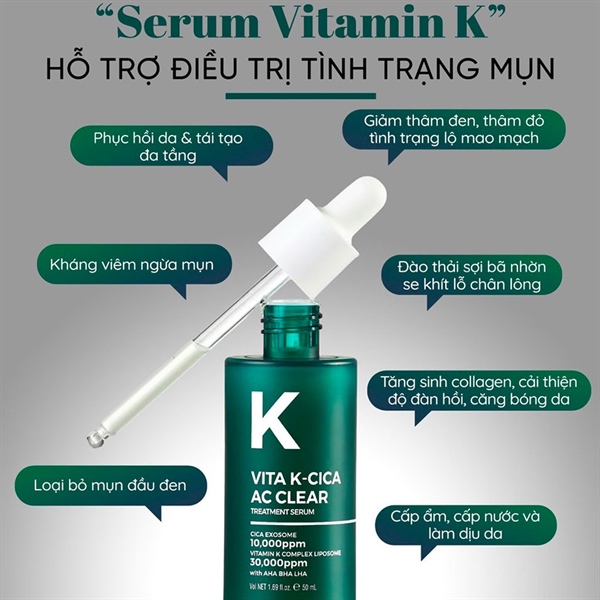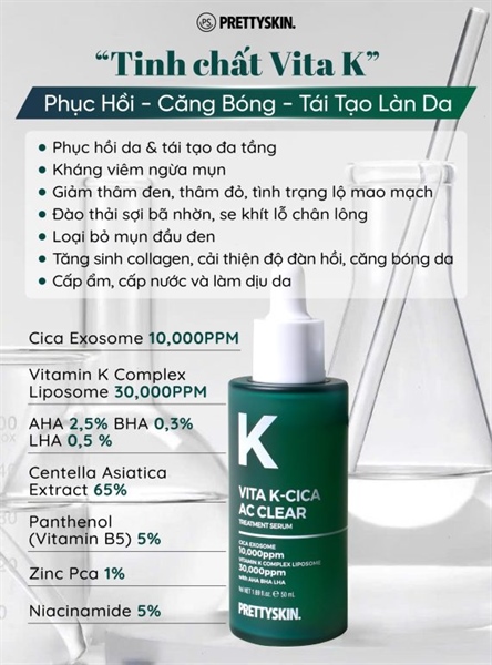 Tinh chất Pretty Skin Vita K-Cica AC Clear Treatment Serum giúp phục hồi tái tạo da, dưỡng da căng bóng, giảm mụn, giải quyết tình trạng viêm lỗ chân lông…