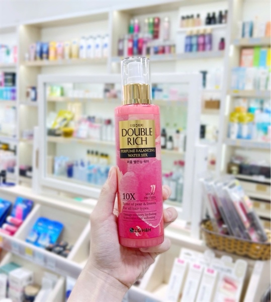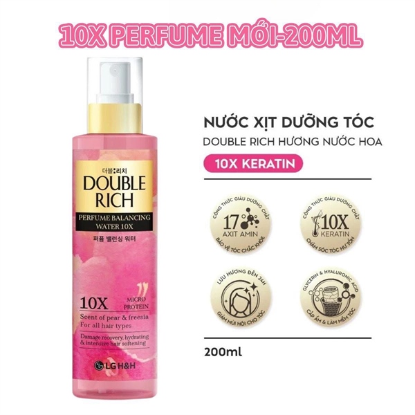Xịt Dưỡng Tóc Double Rich Perfume Balancing 10X 200ml là sản phẩm dưỡng tóc 2 trong 1 với công thức nâng cấp chứa 10X Keratin cùng 17 loại axit amin, Glycerin, và Hyaluronic Acid giúp nuôi dưỡng tóc, cân bằng độ ẩm và cải thiện lớp biểu bì tóc. Sản phẩm có mùi hương nước hoa sang trọng của hoa lan Nam Phi và quả lê, lưu hương lâu đến 24 giờ và còn có tác dụng khử mùi hôi trên tóc.