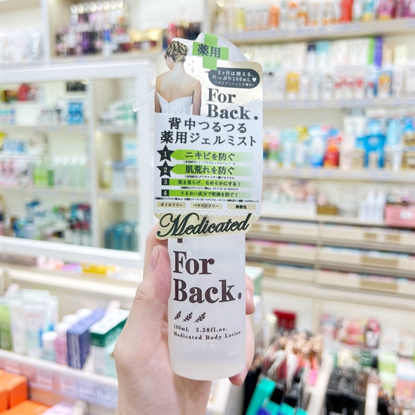 Xịt trị mụn lưng For Back Medicated Body Lotion 100ml là một trong những sản phẩm trị mụn lưng nổi tiếng của Nhật Bản. Với thành phần từ thiên nhiên, AHA, vitamin C, coq10 giúp nhanh chóng tiêu diệt vi khuẩn gây mụn, ngăn chặn sự phát triển lây lan của mụn, đồng thời hỗ trợ hồi phục da, mờ vết thâm mụn, làm sáng da giúp bạn tự tin khi mặc đồ. Sản phẩm an toàn tuyệt đối cho da, không gây kích ứng.